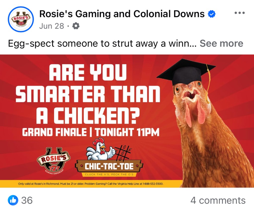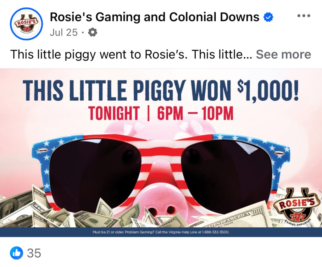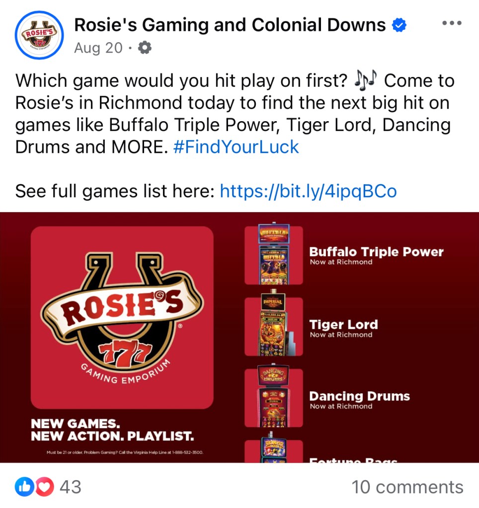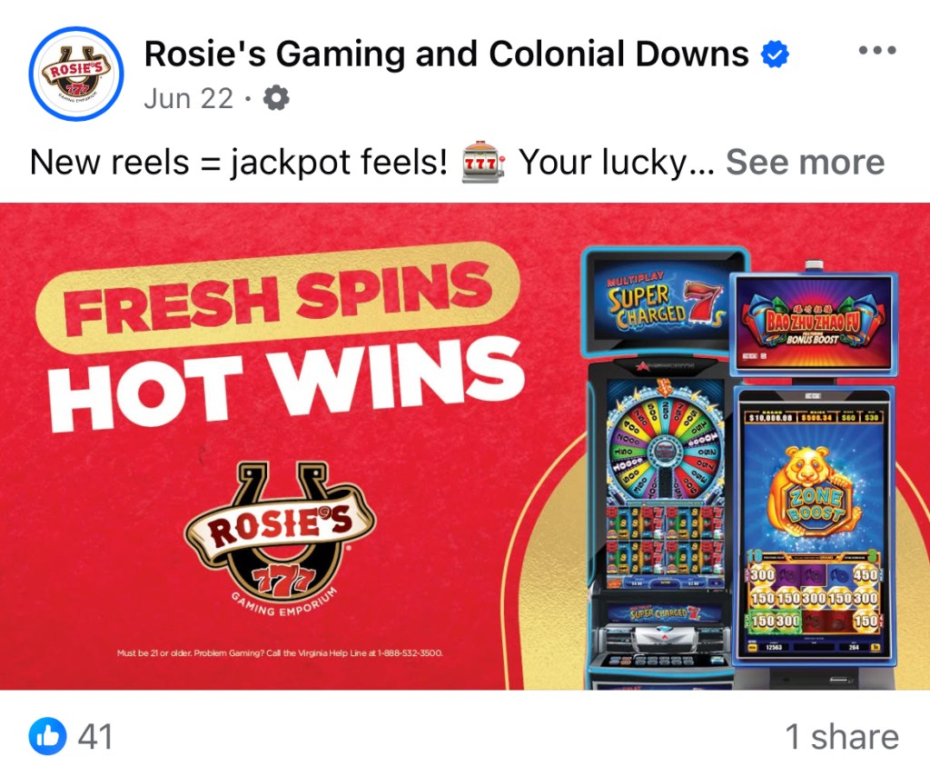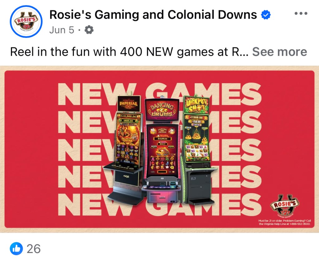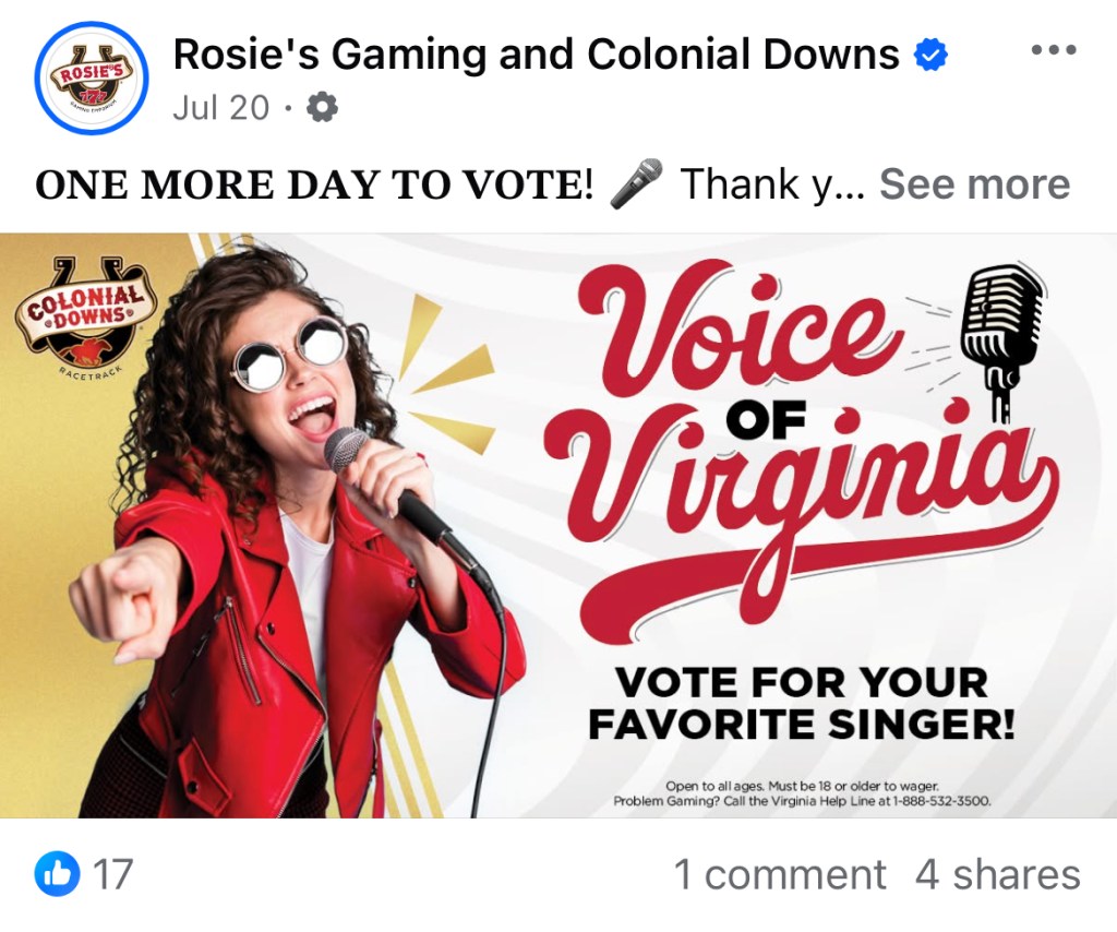 I recently had the opportunity to work in the gaming and hospitality world. This gave me a wide breadth of experience which included the creation of mailers, billboards, menus, property signage, gifs, social media posts, merchandise, emails, web graphics, etc. I especially enjoyed working with the historic Colonial Downs Racetrack as well as working on the foundation of the newly opened Roseshire Gaming Parlor.